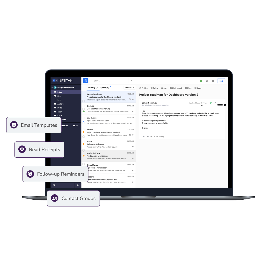 A robust and reliable email service that enables you to keep your communication going, no matter where you are. With email hosting and other features included as part of your custom domain email, you can do more with Titan.